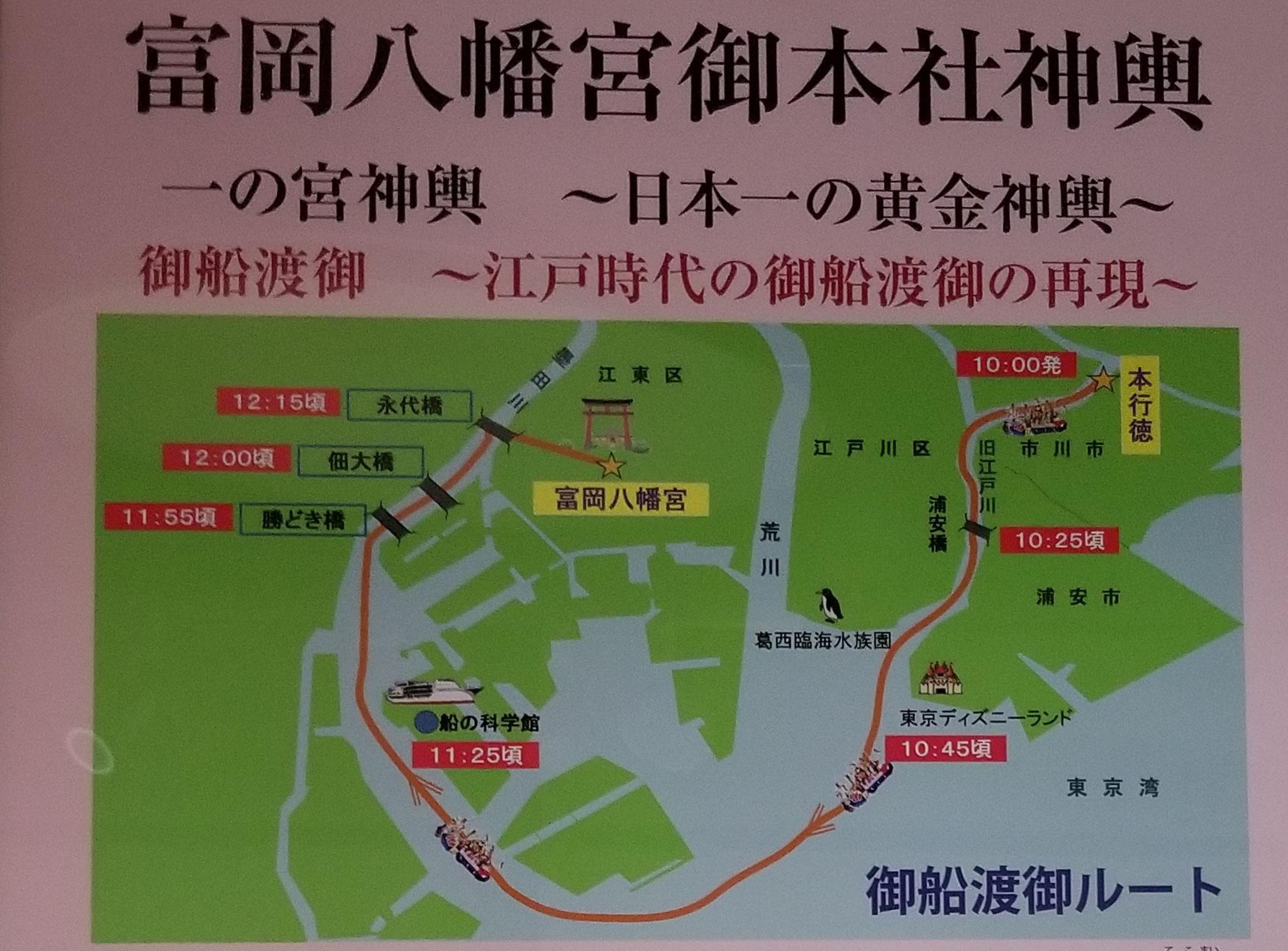 祭り衣装に身を包んだ引き取り手たちが船団を組んで行徳の船着き場にやってきて、高張提灯やのぼり旗を立て竹やしめ縄で飾った船に神輿を積み、祭り囃子や太鼓の演奏、巫女の舞いなどをにぎやかに行いながら川を渡ったといいます。