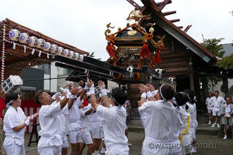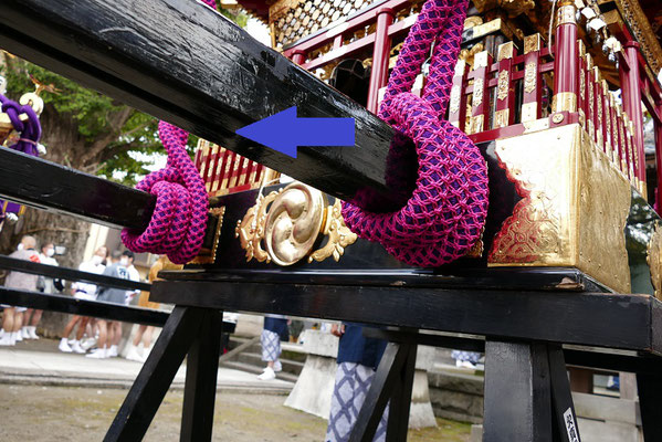 神輿の胴を支える人は、低い半身の態勢で頭を前の担ぎ手の背中(腰上)につけ、腰を中心として体全体を神輿の胴に押し付け、右手を後ろ手にして引っ張り上げるようにします。 このとき、できるだけ手のひらを神輿の胴の台座下奥深くに入れて、上に引っ張り上げるのがコツだとか。力の入れ具合が特に難しい場所だそうです。 |
