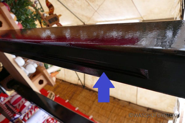 行徳の神輿の担ぎ棒には、地すりのときに指を引っ掛けやすいように、下部に溝が彫ってあるものが多いです。