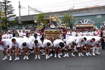 渡御の始めと終わり、あるいは途中要所要所で「さし」「放り受け」「地すり」という独特の揉み方を披露します。